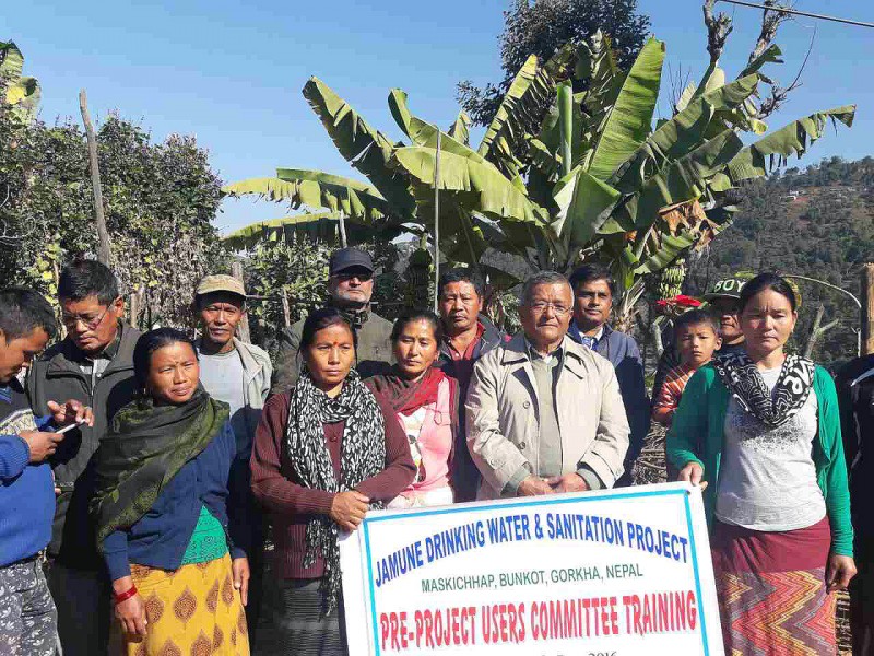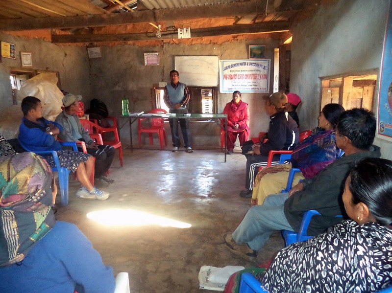 Démarrage des journées de formation destinées au Comité des Usagers du futur réseau d'eau de Maskichhap au Népal. Notre partenaire local l'ONG "IDCN" a envoyé ses formateurs (M. Dhan Bahadur, Kalpana Dawadi et Ashakaaji Shrestha) au village pour trois journées de formation portant sur l'organisation du Comité, la gestion future du réseau mais aussi sur des questions générales concernant l'hygiène et l'importance de l'assainissement des eaux sales.