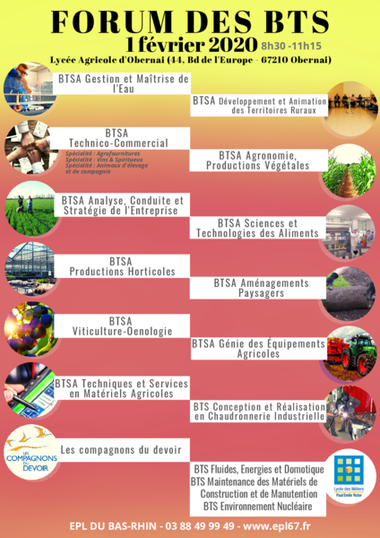 Du côté des futurs étudiants, l’heure des choix se rapproche avec l’ouverture de Parcoursup. C’est dans l’optique de faciliter l’orientation post bac des élèves que sera organisé le 1er février prochain au lycée agricole d’Obernai un Forum des BTS (cf. affiche).