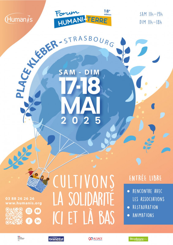 Le Collectif d’associations de solidarité HUMANIS organise la 18e édition Forum HUMANI-TERRE du 17 au 18 mai 2025 sur la place Kléber à Strasbourg sous le thème de « Cultivons la solidarité ici et là-bas ». À travers les stands d’associations, ce forum permettra de sensibiliser sur les enjeux du secteur de la solidarité, tout en mettant en avant les projets et réalisations des associations présentes.