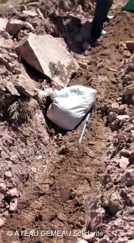 Mai 2022: le tuyau est protégé par du sable apporté à dos d'homme...ou de femme!